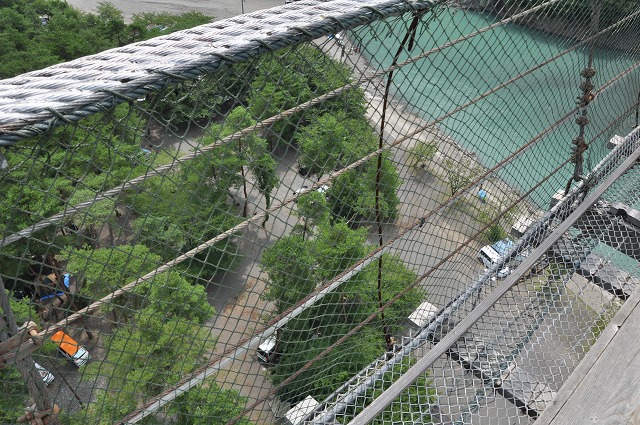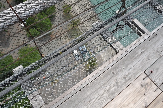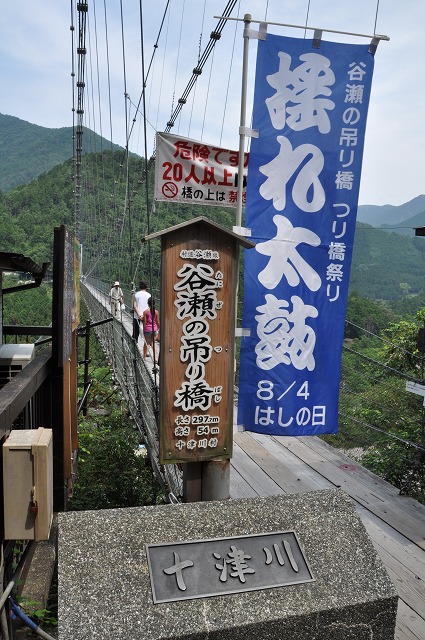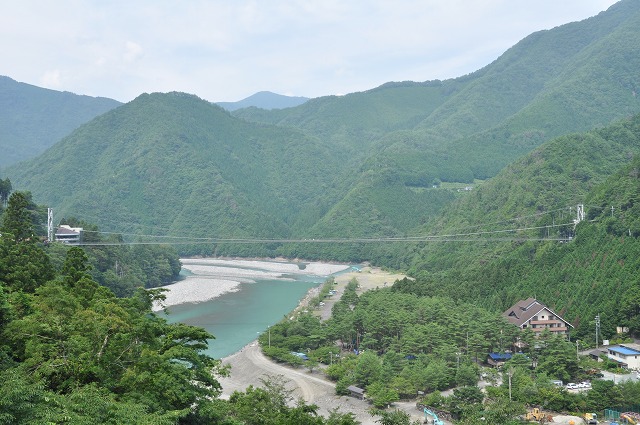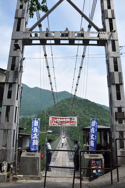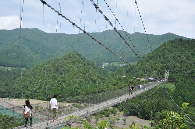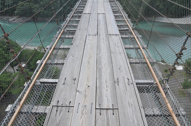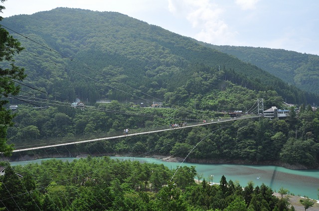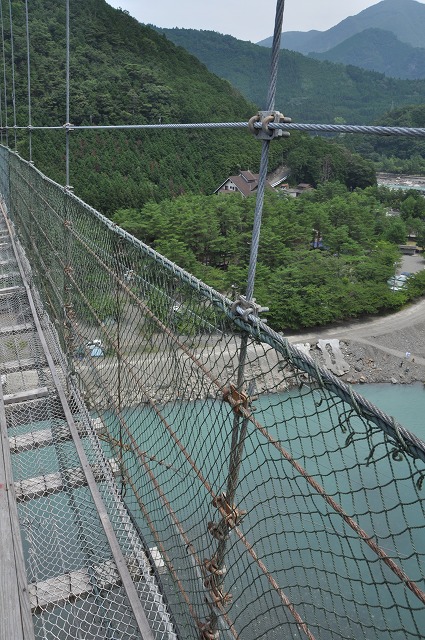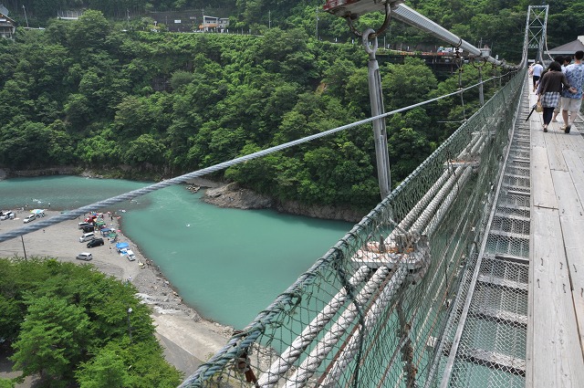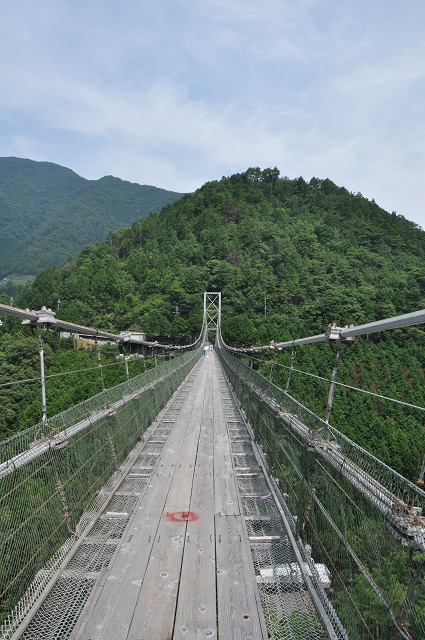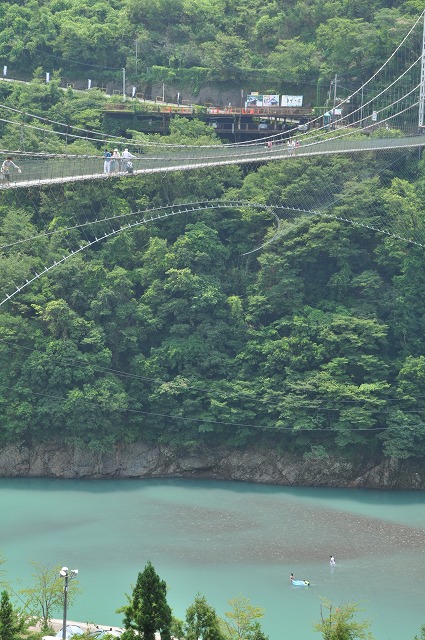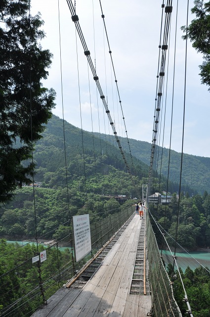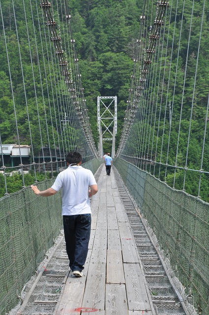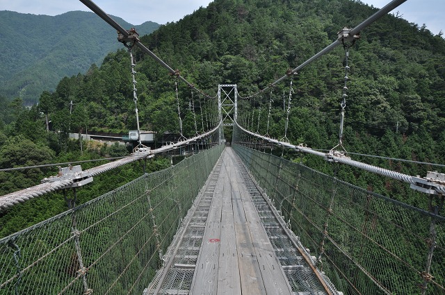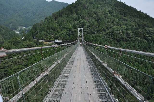 奈良県 十津川村にある吊り橋です。 1954年(昭和29年)架橋で、高さ54m、長さが297mある日本最長の鉄線の吊り橋です。 橋の中央に建設現場などでよく見かける木板が4枚敷いてあります。 板の下にはおそらく何もないと思われます。 歩み板の両サイドと側面はワイヤとメッシュで覆われていますので落ちる心配はありません。 ただ、中央部付近や人が固まって渡り始めた時にはかなり揺れます。 人とすれ違う際にはぶつからない様に注意が要ります。 高所恐怖症や乗り物酔いの酷い人には地獄なので渡る前によく確認しましょう。(渡ったら戻って来ないといけません) 対岸に渡った際によく聞こえてくるのが、「怖かった」「止めればよかった」「帰りも渡らないといけない・・・」などなどで、 「良かった」という声は少なかったです。 ただ、橋の造りが立派なので高い所や変な所が大好きな人にとっては少々物足りない感じがあります。 もっと狭くて側面がメッシュじゃないのを期待していたので個人的には残念でした。 地元住民が当時の金額で20~30万円を出し合って架けられた生活道路です。 その為、地元の人たちは自転車やバイクで渡ったりしています。 観光客は禁止で徒歩のみです。(禁止されていなくても乗りたくないですが・・・) 先述の通りよく揺れて人に迷惑がかかるので走らない様にしましょう。 |