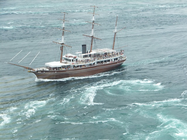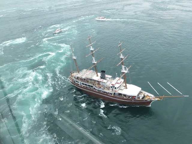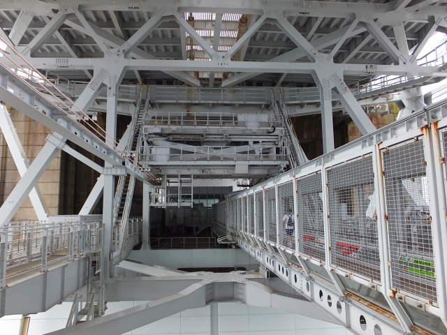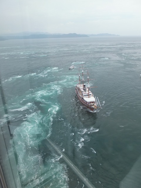 大鳴門橋は兵庫県 南あわじ市(淡路島)と徳島県 鳴門市(大毛島)間に架かる吊り橋です。 渦潮で有名な鳴門海峡の最狭部を結んでいます。 1976年に着工し1985年に開通しました。 神戸淡路鳴門自動車道の一部で、瀬戸中央自動車道(瀬戸大橋)、西瀬戸自動車道(しまなみ海道)と3ルートある 本州四国連絡橋の一つを担っています。 橋長1,629m、中央径間876m、幅25m、主塔高さ144.3mです。 上下2層式になっていて上部に6車線の道路、下部に新幹線規格の複線を通す事ができます。 (現在は道路が暫定4車線、鉄道は未定となっています) 当初の計画ではこの橋を四国新幹線が通り、淡路島経由で大阪と繋がる予定でしたが、本州−淡路島間に架かる 明石海峡大橋が予算や地盤の関係で道路単独橋として建設された為、使用されずにそのままとなっています。 日本の道100選にも選ばれています。 渦の道は先述した様に鉄道部分が使用される見込みが無い為、改造し展望施設を設け観光施設として公開したものです。 橋のケーブルを支えるアンカーブロックの上部から橋の下層部分に入ります。 全長約450mの遊歩道で終端は展望室となっています。海面からの高さは45mになります。 展望室が渦潮の出来る場所のほぼ真上にあるので、渦潮を真上から見下ろせる様になっています。 |