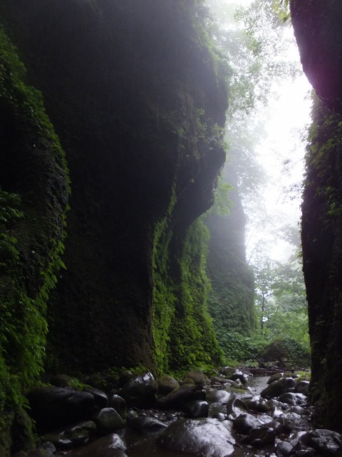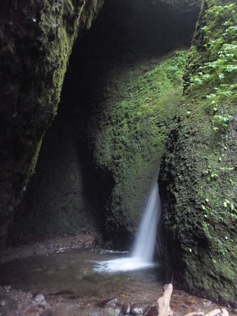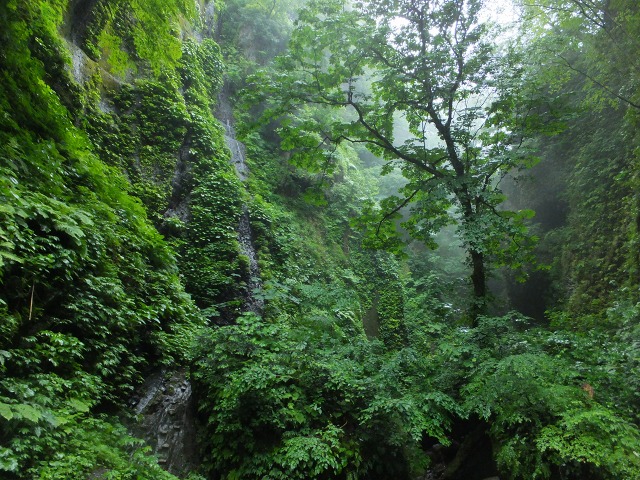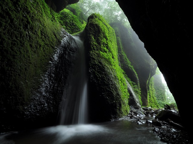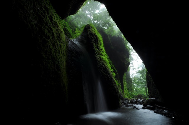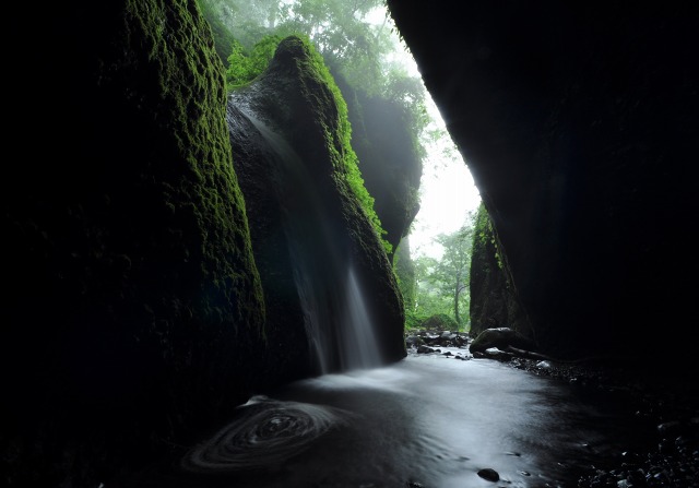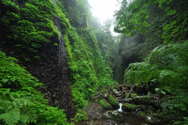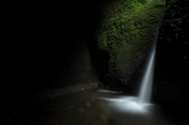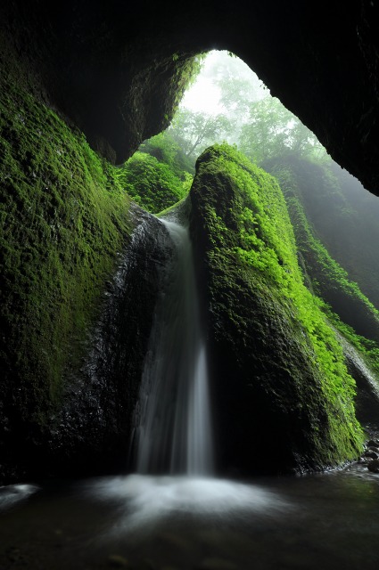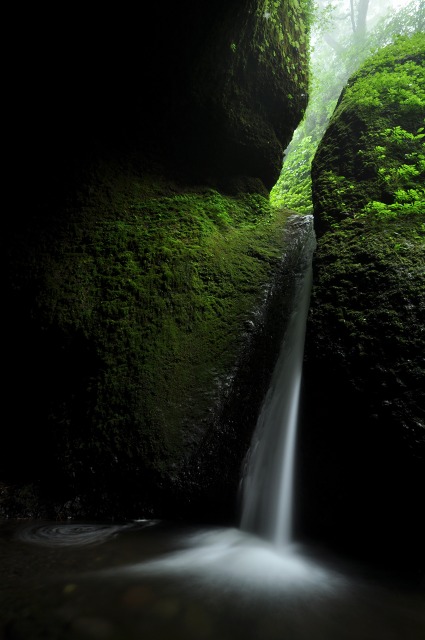 兵庫県 新温泉町にある滝です。 落差は約10mです。 知る人ぞ知る名瀑のひとつです。 滝は洞穴の中に向かって岩の窪みから落ちています。 ドーム状になっている洞穴上部の岩の切れ目からから差し込む光が相まって 神秘的な雰囲気を出しています。 かつて女人禁制で修験者が修行をしていたという伝説もあります。 今回は天候が悪く霧で真っ白の中の撮影でした。 道中では時期的に棚田が見れる様ですが、霧で全く分かりませんでした。 木々の葉が雨で濡れていたため緑は鮮やかで綺麗でした。 洞穴は奥行きが無いので滝全体を写真に納めたい場合は広角レンズが必要です。 駐車場から約1.2kmほど歩きます。途中足場が悪く危険な箇所があります。 それなりの装備で無理しない様にする必要があります。 滝前100mは沢沿いを歩きますのでトレッキングシューズ以上が良いです。 |