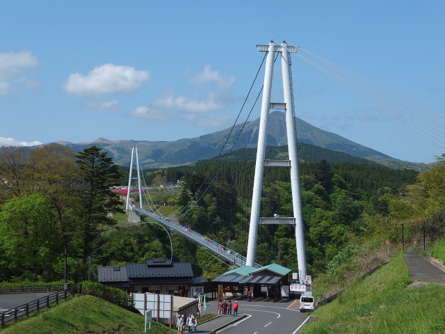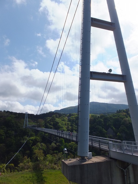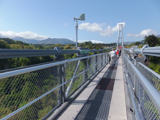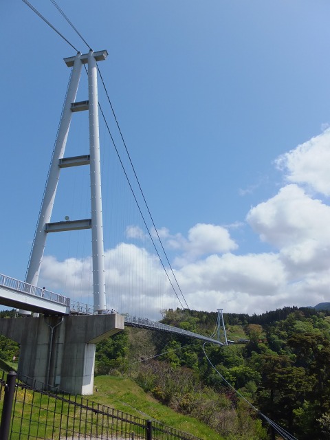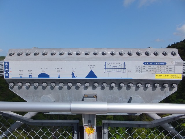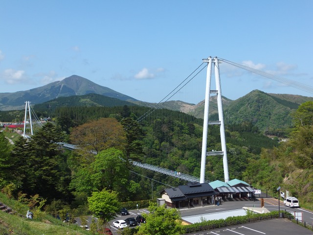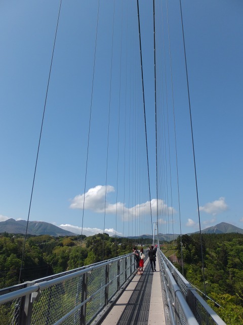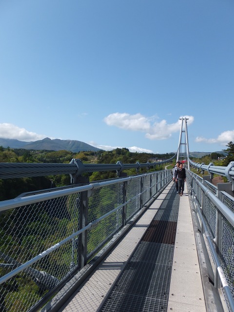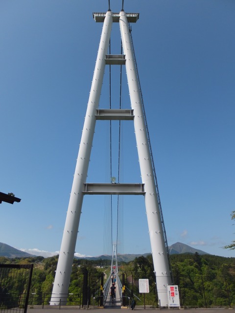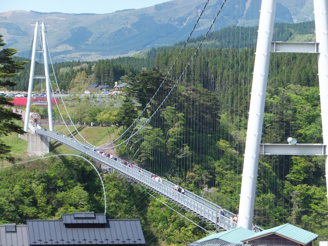 大分県 九重町にある吊り橋です。 歩行者専用吊り橋では、高さ長さが日本一です。 橋からは日本の滝百選の震動の滝や、九酔渓の美しい紅葉を眺める事が出来ます。 標高777mの所にあり、高さ177m(水面より)、長さ390m、主塔高さ43m、幅員1.5mです。 設計耐荷重は117tあるようです(大人65kg×1800人) 2004年に着工し2006年10月に開通しました。総工費は20億円だそうです。 開通したのが紅葉の時季と重なった為、9日間で10万人が訪れ、24日後に年間目標の30万人を達成しました。 さらに半年弱で100万人も達成しています。 その後も順調に入場者数は増え2015年6月に900万人となっています。 傘をさしての通行は出来ません。天候不良の時は注意が要ります。 両側にゲートが有り、入場後は反対側を一度だけ出入り出来ます。入場時に押印されます。 ゲート内に居る間は橋を何回でも通行可能です。 |