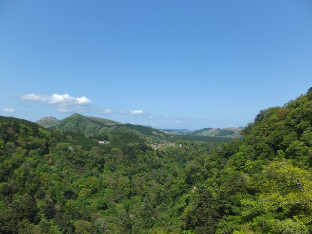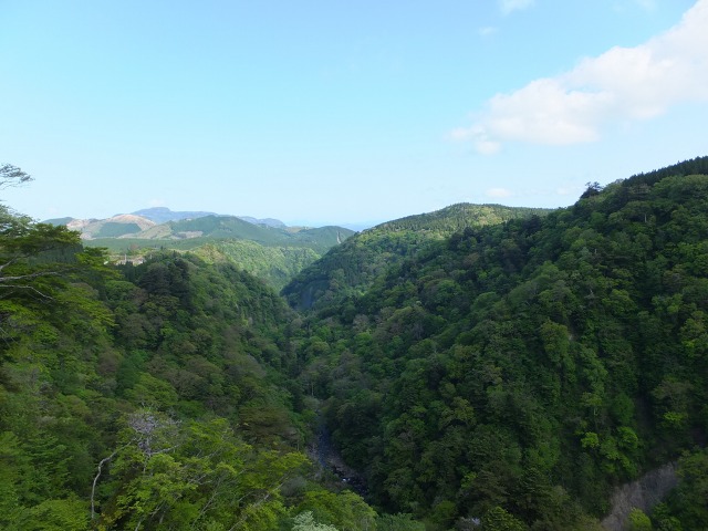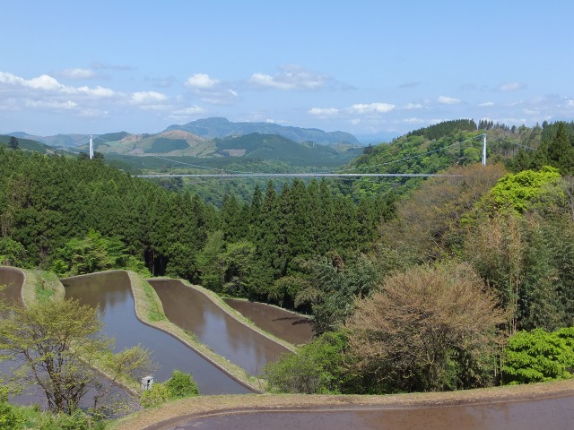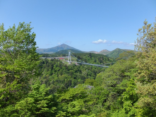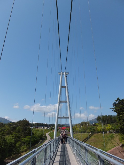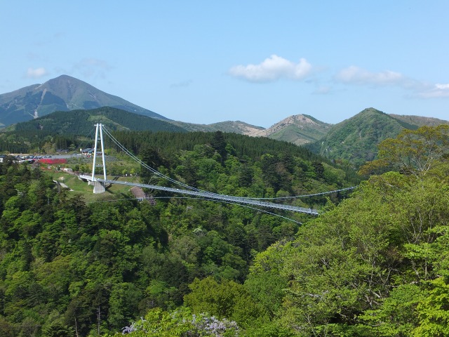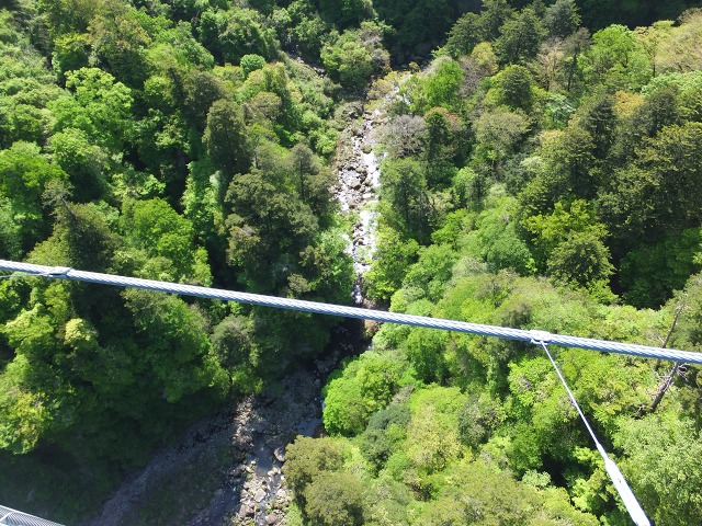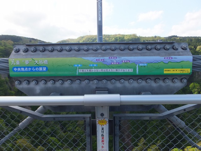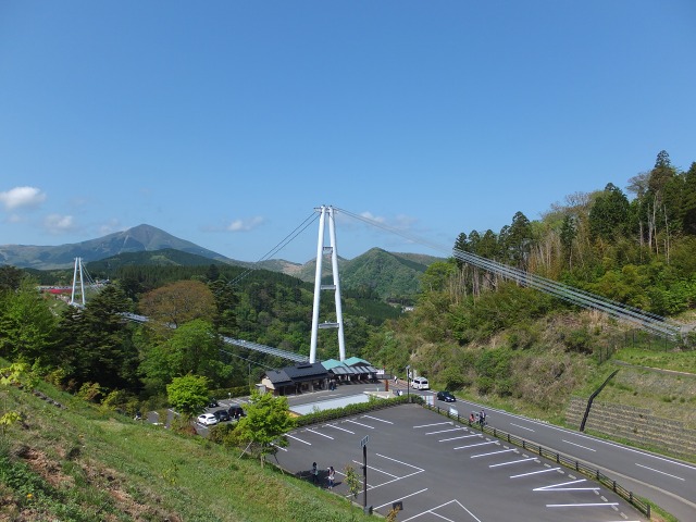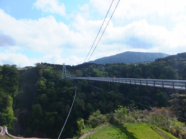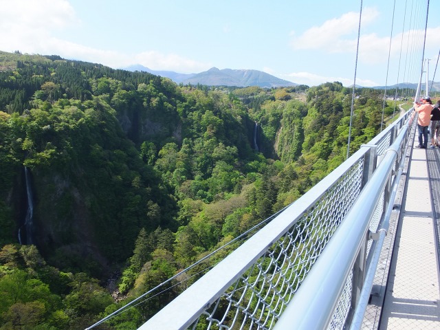 大分県 九重町にある吊り橋です。 歩行者専用吊り橋では、高さ長さが日本一です。 橋からは日本の滝百選の震動の滝や、九酔渓の美しい紅葉を眺める事が出来ます。 標高777mの所にあり、高さ177m(水面より)、長さ390m、主塔高さ43m、幅員1.5mです。 設計耐荷重は117tあるようです(大人65kg×1800人) 2004年に着工し2006年10月に開通しました。総工費は20億円だそうです。 開通したのが紅葉の時季と重なった為、9日間で10万人が訪れ、24日後に年間目標の30万人を達成しました。 さらに半年弱で100万人も達成しています。 その後も順調に入場者数は増え2015年6月に900万人となっています。 傘をさしての通行は出来ません。天候不良の時は注意が要ります。 両側にゲートが有り、入場後は反対側を一度だけ出入り出来ます。入場時に押印されます。 ゲート内に居る間は橋を何回でも通行可能です。 |
