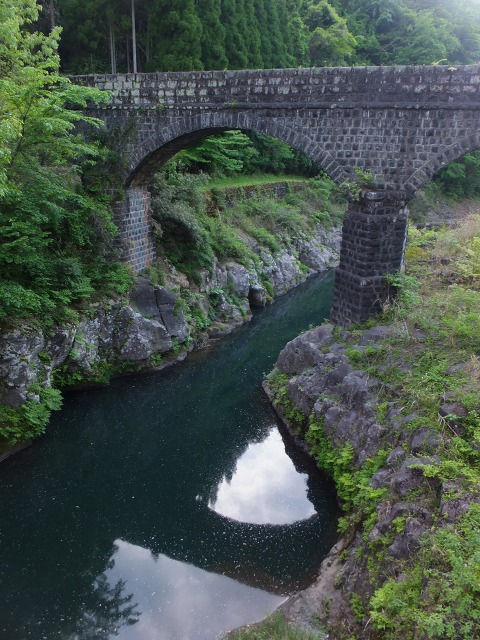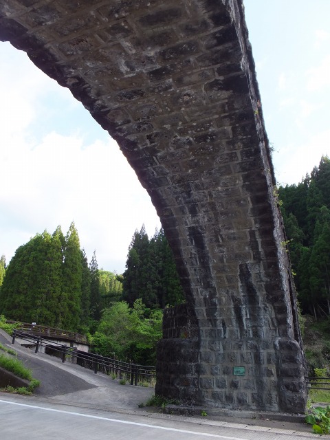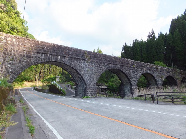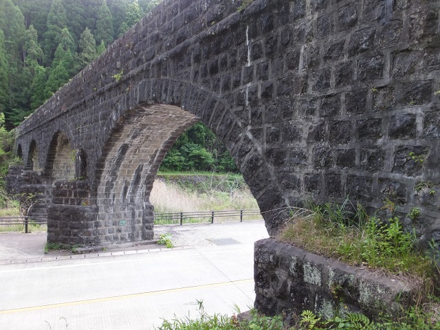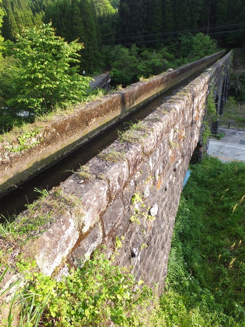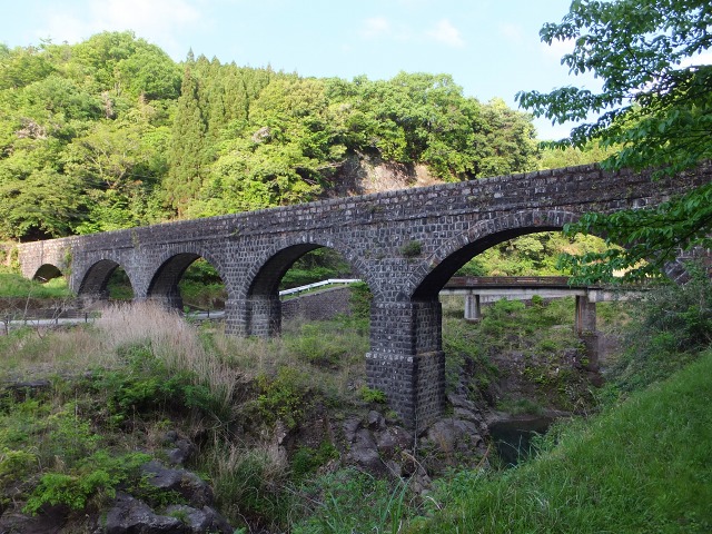 大分県 竹田市にあるの水路橋で、国内最大規模の水路用石造アーチ橋です。 明正井路一号幹線一号橋(めいせいいろいちごうかんせんいちごうきょう)と読みます。 また、橋の名称板にあるように明正井路第一拱石橋(めいせいいろだいいちこうせききょう)とも呼ばれています。 1924年(大正13年)に竣工した明正井路一号幹線の一部で、橋は1919年(大正8年)に完成しました。 明正井路は江戸時代末期に構想され、明治に計画し、大正で着工・完成した総延長175kmに及ぶ大規模な灌漑用水です。 起伏が激しく、多くのトンネルと大小17基の水路橋が建設されました。 資金難や難工事、戦争による資材不足など幾多の困難に直面しながらも建設が続けられ、開田面積約402haという広大な 面積を潤す重要な水路となりました。 構造は6連石造アーチ橋で、橋長78.0m、橋高13.0m、幅2.8m、アーチ幅10.7mとなっています。 下には緒方川が流れていますが、川は1連で跨いでおり他の5連で谷を跨ぐ構造となっています。 2002年、平成14年度 土木学会による選奨土木遺産に認定されました。 |